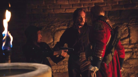 The acquisition of the sword leads in to “Akeda”, during which Abbie, Ichabod, Irving, Jenny, and Katrina make their final stand against Moloch. As lightning and bloody hail rain down on them, Abbie and Ichabod desperately try to make it to Katrina before something happens to her. They manage to make it in time to stop Abraham from making her his headless bride, but an attempt to kill Abraham once-and-for-all goes awry when he reveals that using the Sword of Methuselah will kill both the target and the user. Convenient.